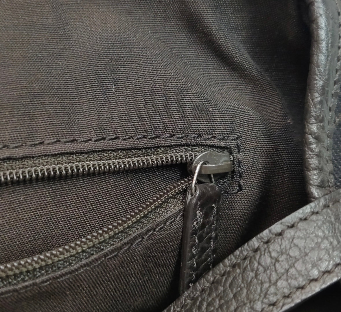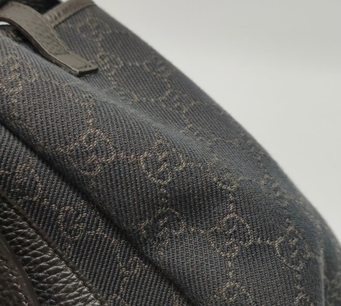 Canvas shows light overall wear and softening. Leather trim shows creasing and minor surface wear, particularly near the straps and edges. Interior shows signs of use. Hardware shows light scratches. Structurally sound and fully functional.