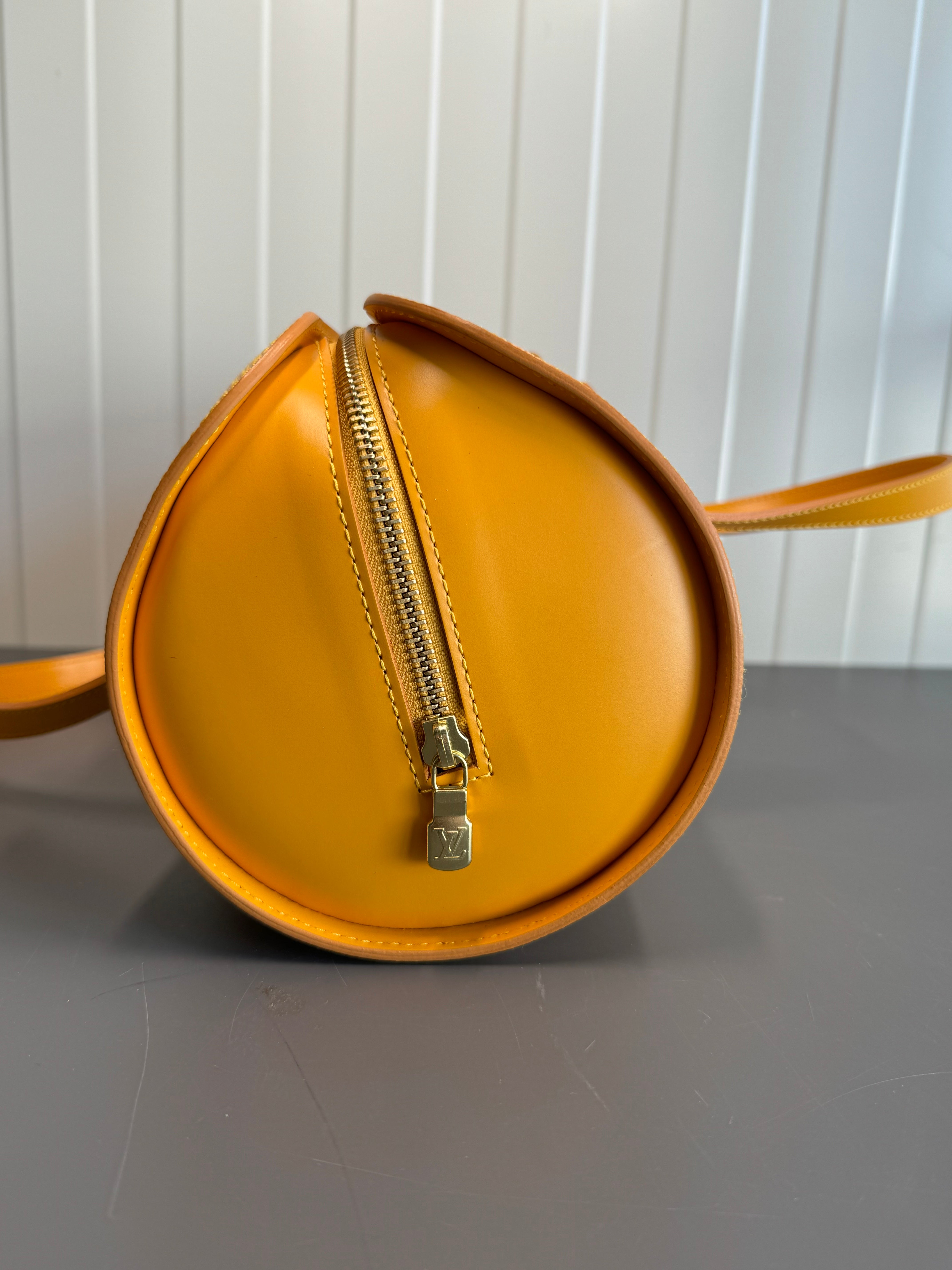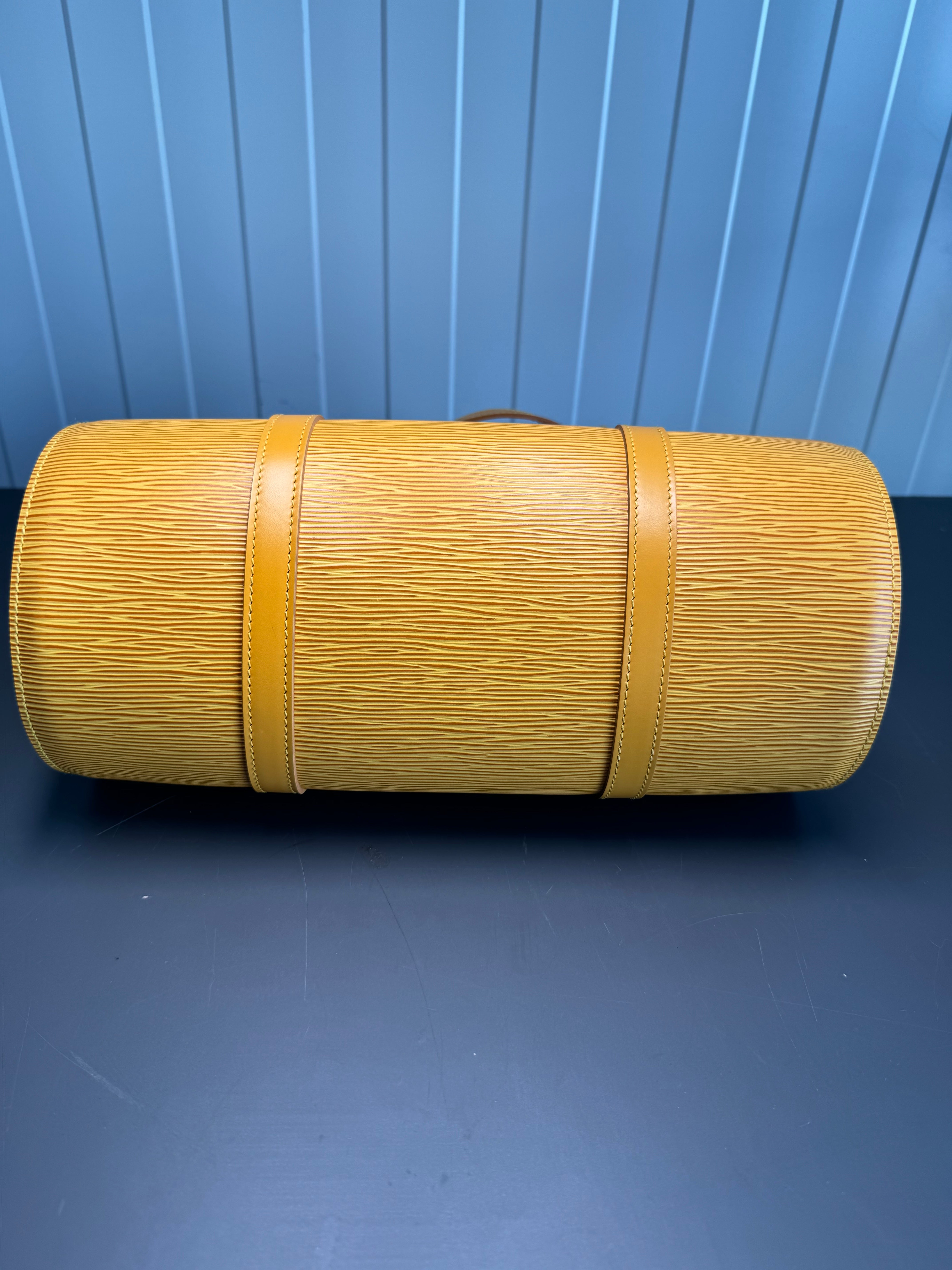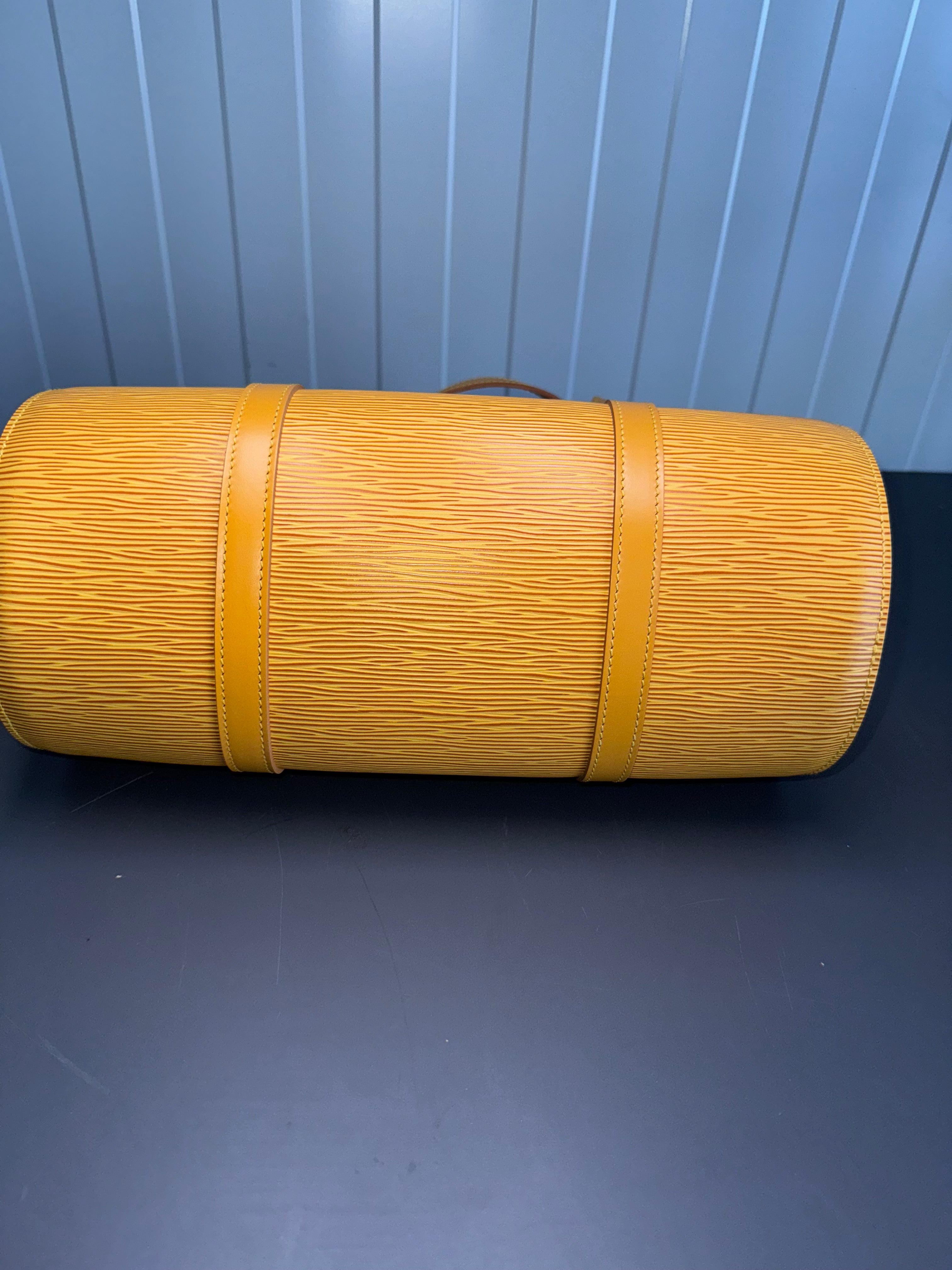 A bold take on a Louis Vuitton classic. The Papillon 30 is crafted in vibrant yellow Epi leather with a clean cylindrical silhouette and smooth leather straps. Finished with gold-tone hardware and paired with the original matching mini pochette, it’s a statement piece that still feels effortless and wearable.