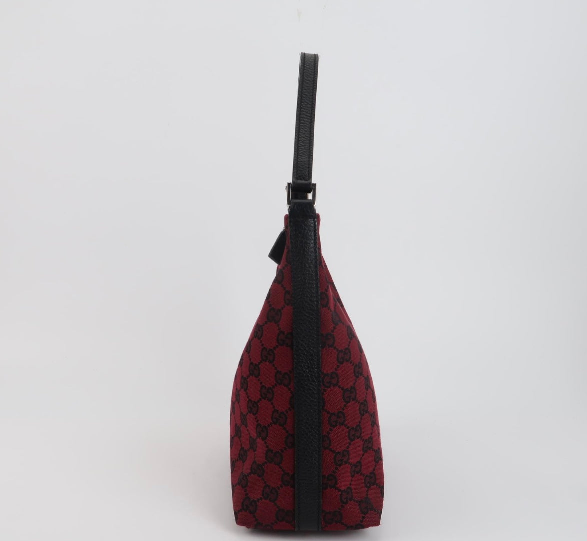A compact shoulder bag with a sharp color hit. The classic GG monogram is woven in deep red canvas, contrasted with black leather trim for a clean, graphic finish. Lightweight, easy to wear, and very much in line with Gucci’s late-90s to early-2000s approach to everyday bags. Simple silhouette, strong presence.